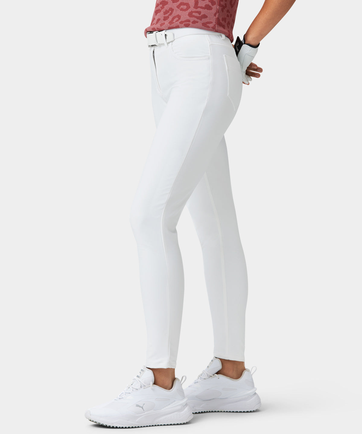 These off-white five pocket trousers may look like your everyday pants, but are in fact jammed with performance properties which makes them perfect for golf. The stretchy twill fabric is lightweight and soft which makes them extremely comfortable to wear, while the tapered fit of the trousers ensures a form fitting look and feel. Equipped with an elastic waistband with silicone gel lining which prevents your golf shirt from riding upwards.