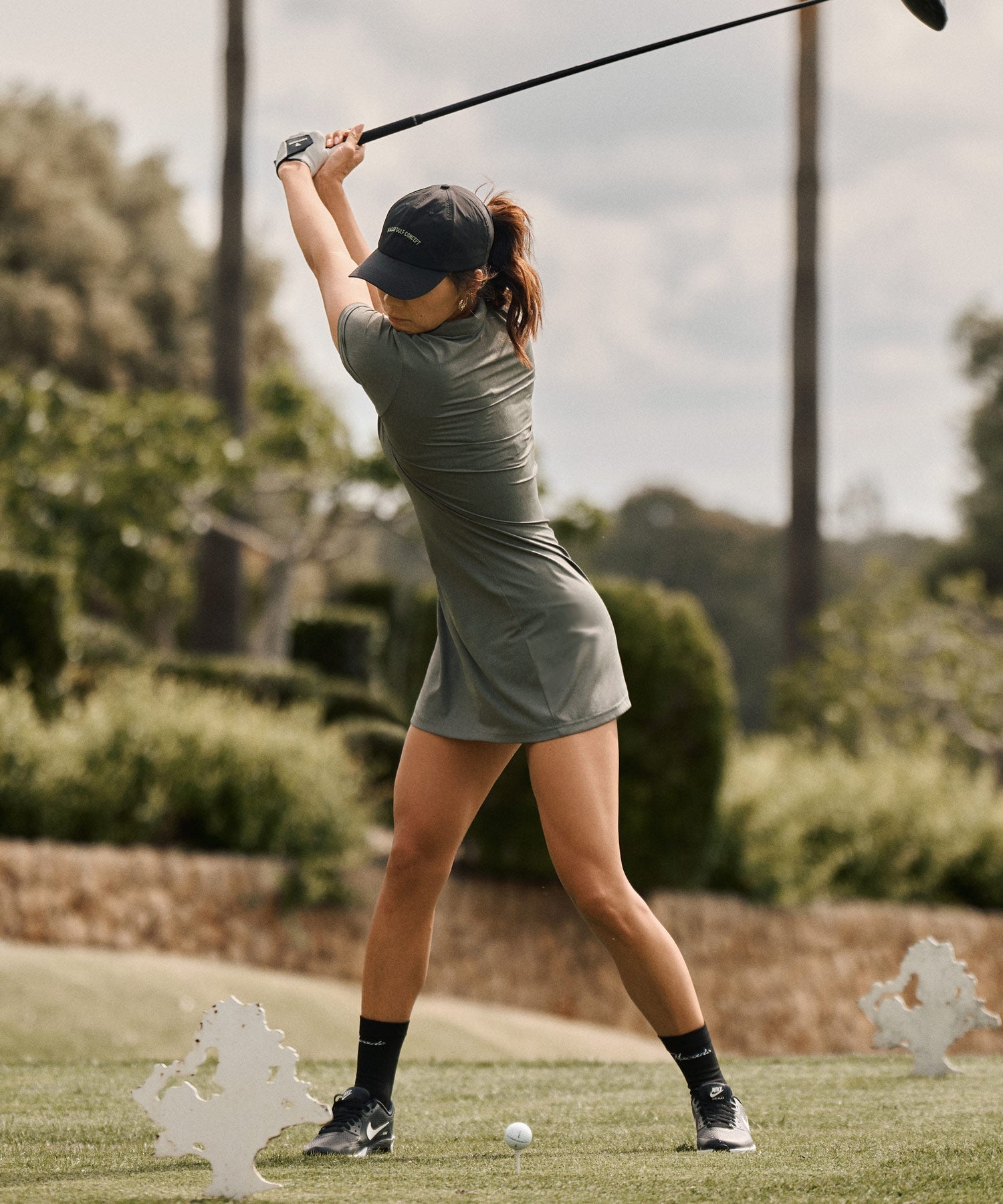 A Sleeveless performance dress with a streamlined silhouette and a subtle textured surface. The stretch fabric allows comfortable movement while maintaining a polished appearance. A confident one-piece option for warm days on the course.
