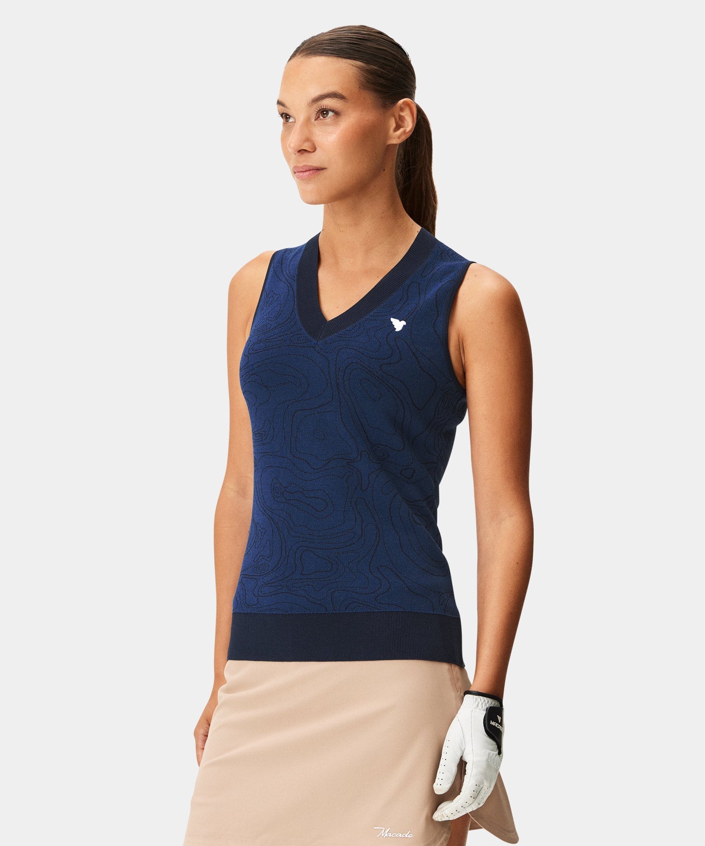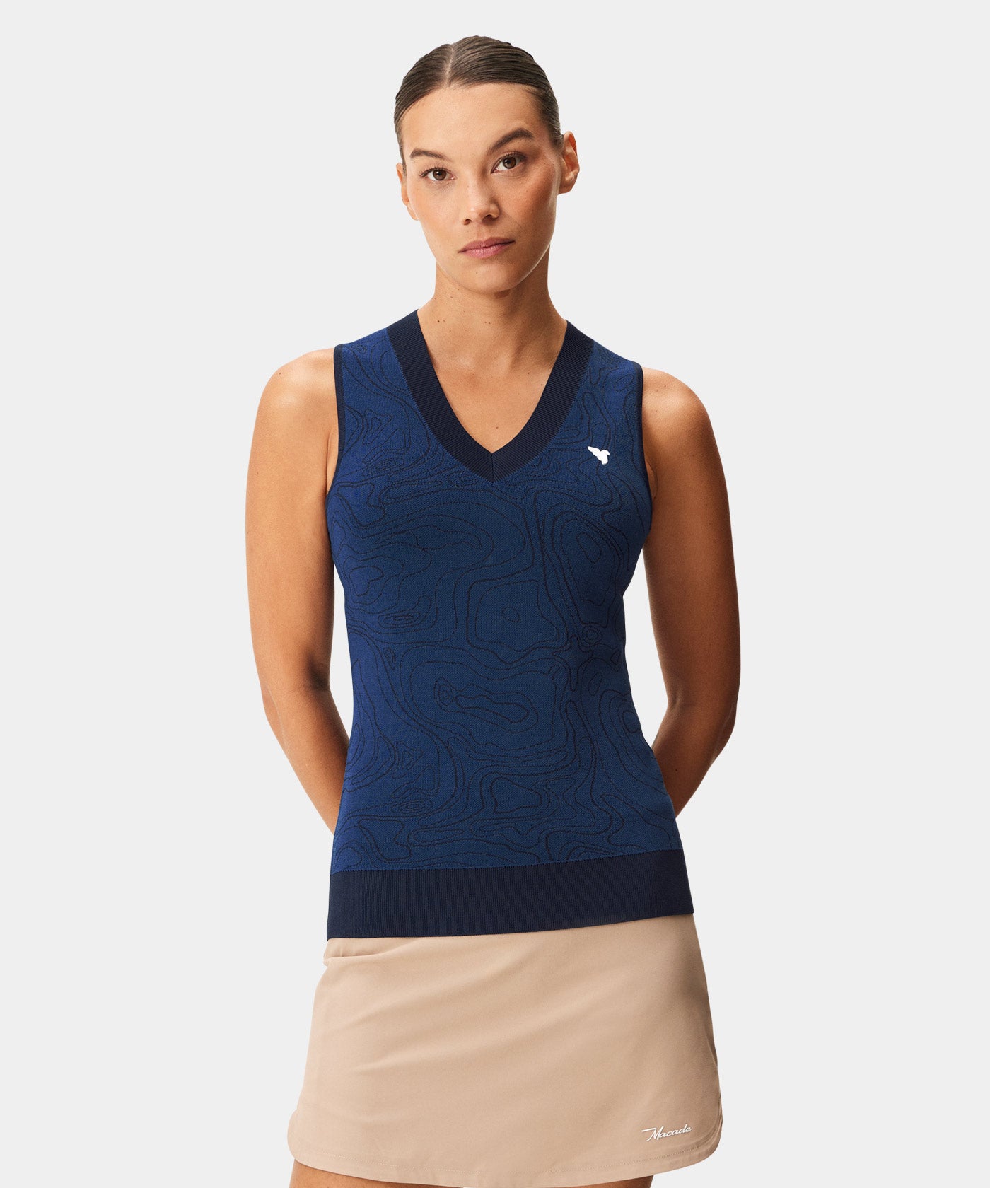 A sleeveless performance top with an open collar and a clean, modern silhouette. The lightweight stretch fabric feels breathable and composed through movement. An easy choice for warm days on the course or casual clubhouse styling.