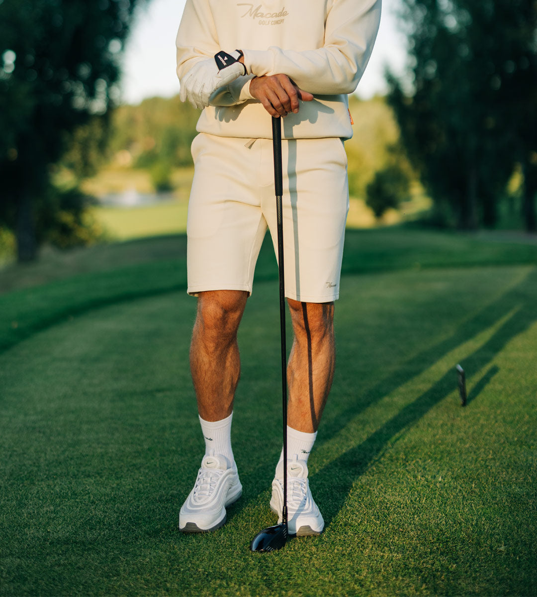 These Powder Blue Range shorts are designed for a relaxed/weekend fit. Cut from a heavyweight fabric which grants the shorts some character. The front silicone golf logo give these shorts a sporty vibe while the drawstring at the front allows for endless comfort.